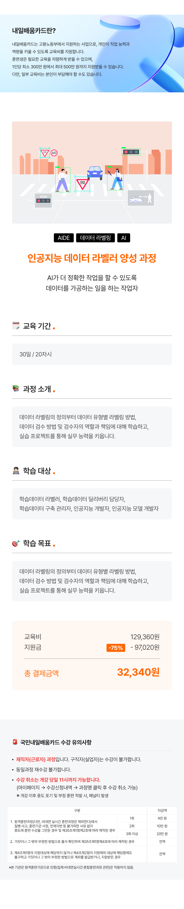 [과정소개]교육기간 : 선택 항목 중 ○ 일반 훈련생 : 자비부담 교육비는 32,340원 입니다. ○ 교육비 0 원의 경우에는 기초생활수급자 및 차상위계층 등 기타 유형 훈련생분들만 신청이 가능합니다. ○ 교육비 16,170 원의 경우에는 근로·자녀장려금 수급자 유형 훈련생분들만 신청이 가능합니다. ※ 일반 훈련생분들이 다른 유형의 교육비를 신청하실 경우 자동 수강취소 되는 점 참고해 주세요!