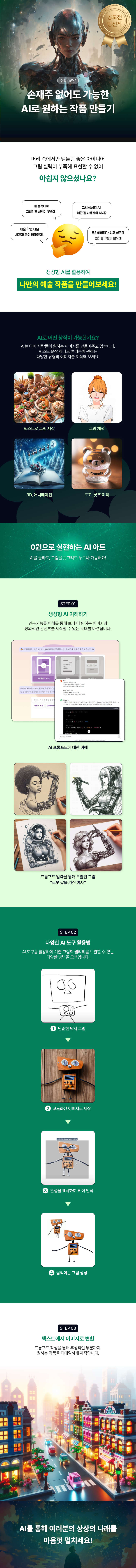 01. Orientation 02. 생성형AI와 예술의 만남 03. 더 나은 작품을 위한 AI와 협업 04. 프롬프트로 예술의 문 열기 05. 예술 표현의 다양성 탐색 06. 작품의 활용 및 수익화 전략 |